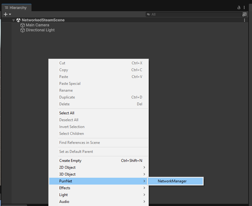 Right-click anywhere in the Hierarchy and go to PurrNet → NetworkManager:
