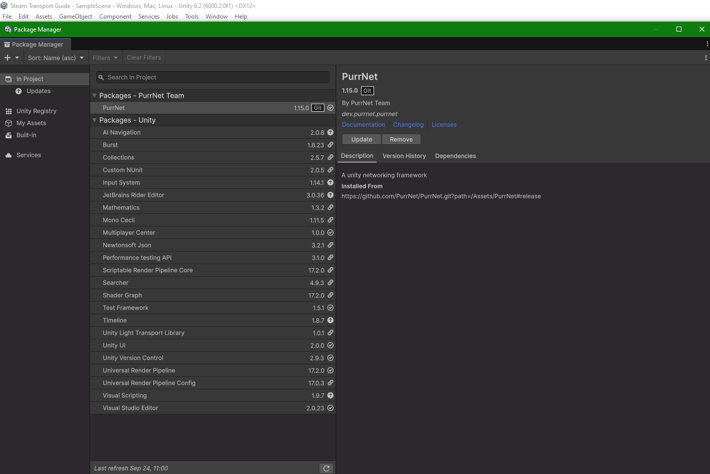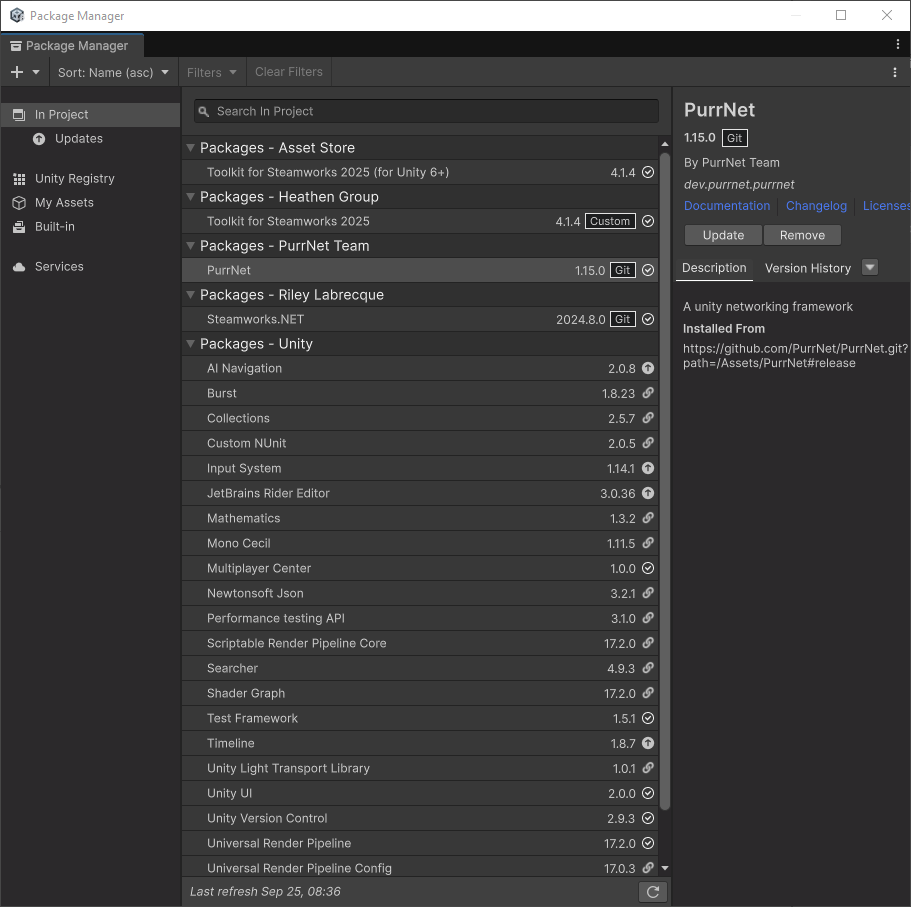For reference, my Package Manager looks like the following after PurrNet installation: