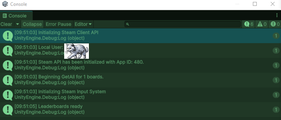 Now that we have everything set up, we can finally test our connection to Steam. Press play, and you should see a series of initialization messages in the console: