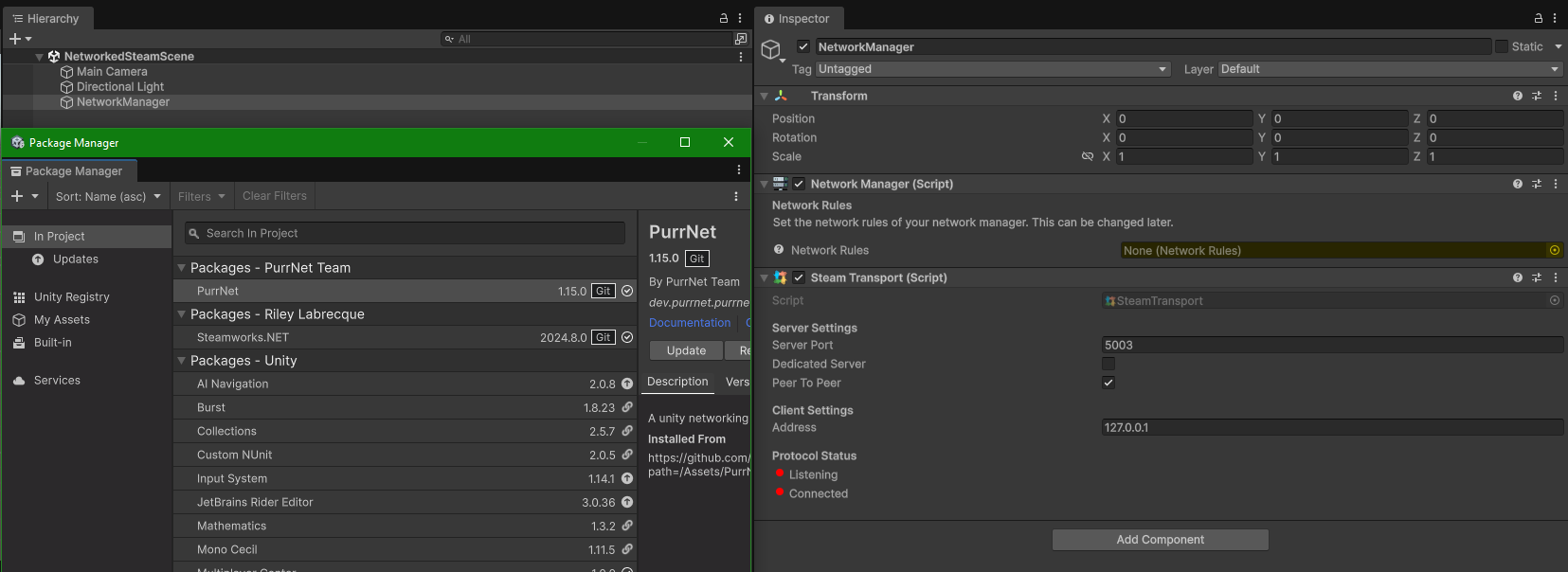 For PurrNet installation instructions please reference the [installation guide](https://purrnet.gitbook.io/docs/getting-started/installation-setup). If you aren't familiar with Heathen's Toolkit for Steakworks SDK I highly recommend checking it out if you're serious about using Steam—it just makes your life easier. If you don't want to use Heathen's, then the script example I show won't work out of the box for you, but the majority of this guide will still be helpful. We will install Heathen's Toolkit at the end of this guide to ensure that everyone can follow along until then.