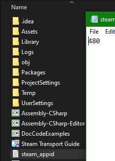 **App ID Remarks:** The 480-app ID is Steams' free app ID for development and testing. When you start your game in Unity, Steam will automatically say that you are playing the game "Spacewar". This is intended and should be used until you register your game with Steam and get an App ID of your own. You can read more about this [here](https://partner.steamgames.com/doc/sdk/api/example)