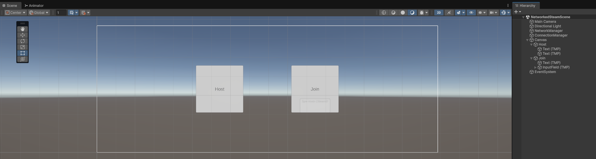 Next, let's add a canvas with a Host and Join button as well as a text field to display the Host ID (that only the host will see) and a text input field that the client can type in. This prompted me to install TextMesh Pro so I installed it: