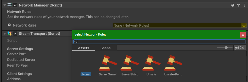 Let's add the [Network Rules](https://purrnet.gitbook.io/docs/systems-and-modules/network-manager/network-rules) to the Network Manager component by clicking the target icon and add the default rules: