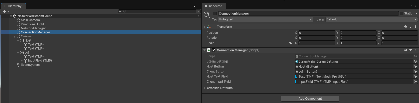 Let's add this script as a component to an empty GameObject in the scene and then drag and drop our Steam settings, buttons, and TMP objects into their SerializedFields.