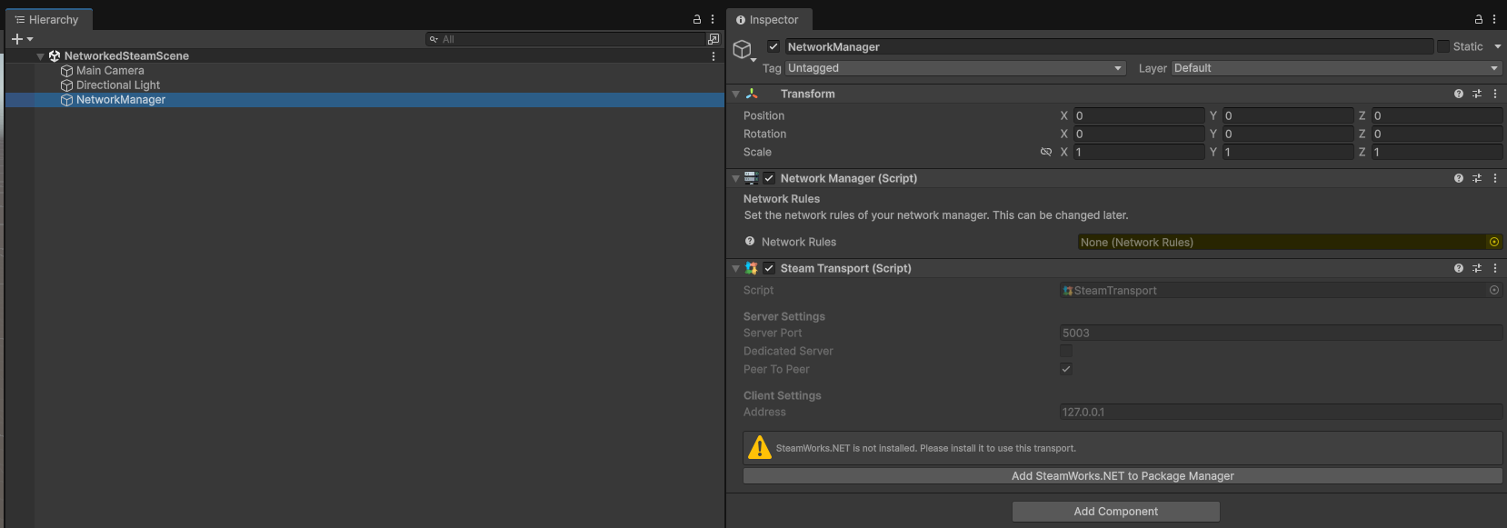 Now click "Add SteamWorks.Net to Package Manager" on the Steam Transport component—this will add Steamworks.NET to your project. If this gives you an error, please make sure you have git installed on your machine.