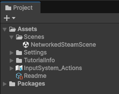 This is a fresh project, so I'm going to start by creating a new scene and putting it in the Assets/Scenes folder. I will call this scene "NetworkedSteamScene" and I will delete the "SampleScene" already in the folder: